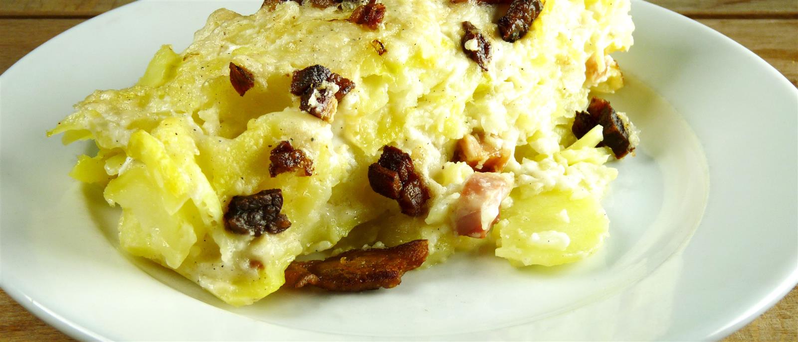 Burgonya, császárszalonna, besamel mártás és reszelt sajt.